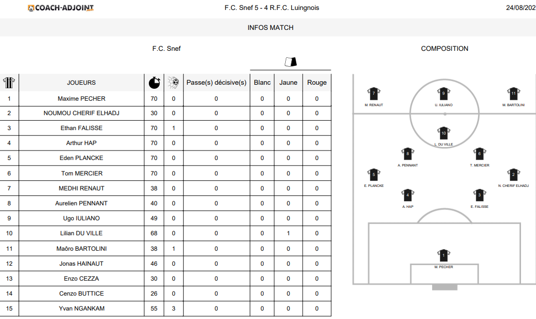 Bon premier match face à une équipe de Luingne qui n'a rien lâché jusqu'au bout. Il y a du travail concernant les distances importantes entre les lignes au moment de la reconversion (B+). Des choix précipités qui nous font perdre la possession, anticiper son choix avant de recevoir demande une concentration supplémentaire...Relevons la tête.