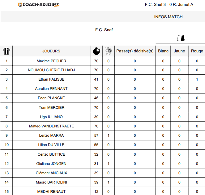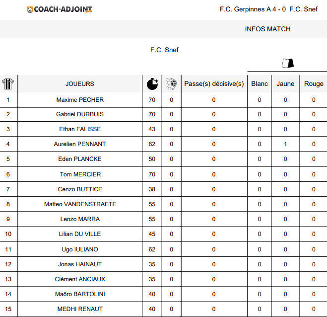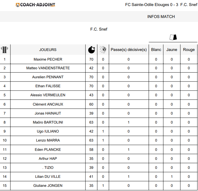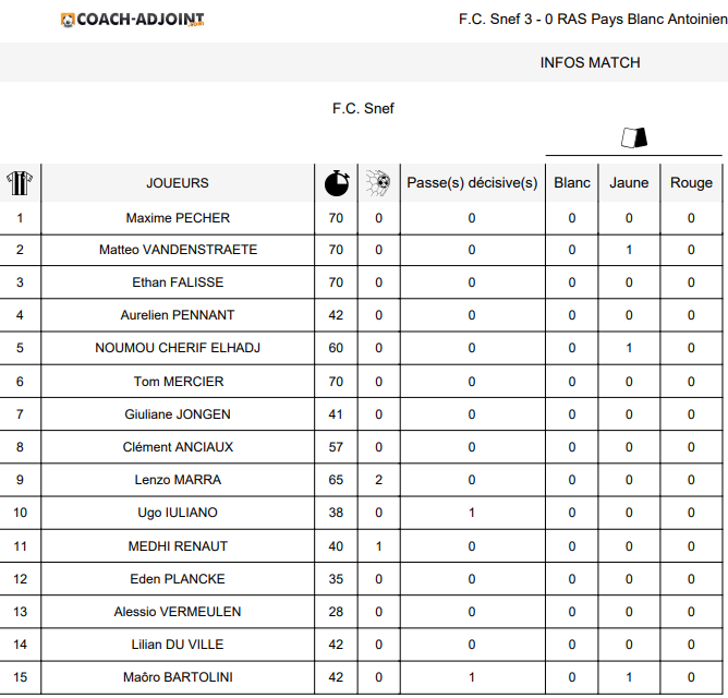 Une première période compliquée pour certains concernant le placement qui heureusement s'est nettement amélioré par la suite, pour preuve aucun buts encaissé en deuxième mi-temps, meilleure occupation des espaces. Suite aux absences de titulaires dans la ligne défensive, Gabriel à très bien assuré. Ethan très confiant pour son retour qui au départ ne faisait pas partie des convoqués, mais vu le forfait de Matteo...