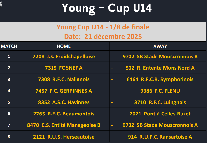 Match de Young Cup dimanche à 9 h 15, ensuite reprise des entraînements le mercredi 7 janvier 2027.